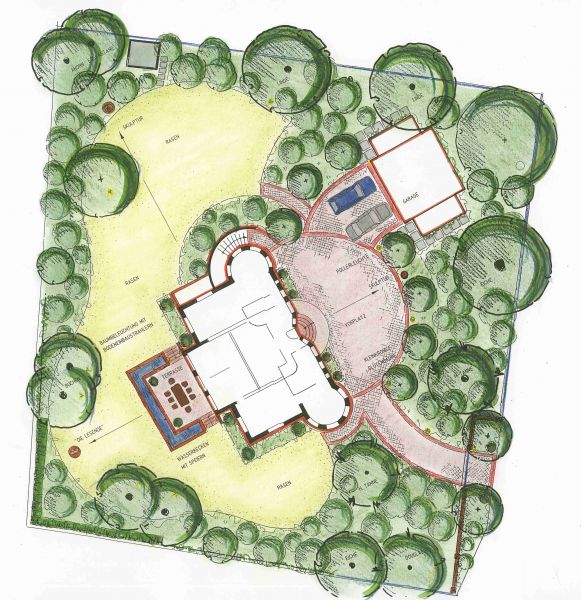 Aufgabenstellung: Ursprünglich sollte zu dem unter Denkmalschutz stehenden Clubhaus im Zuge des geplanten Anbaus nur der Eingangsbereich neu gestaltet werden. Doch schnell zeigte sich, dass sowohl funktional als auch gestalterisch rund ums Gebäude Überarbeitungsbedarf bestand. Es sollte eine repräsentative Außenanlage mit pflegeleichter Begrünung und harmonischer Einbindung des Neubaus entstehen, dabei sollten die Verkehrs- und Wegebeziehungen neu geordnet (Trennung von Fuß- und Fahrwegen, Betonung des Hautzuganges), die Terrasse vergrößert, Fahrrad- und Müllstandplätze umgestaltet werden. Betonung und Ergänzung der durch die Lindenallee vorhandenen linearen Struktur der Anlage.