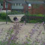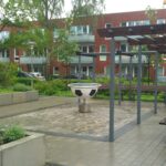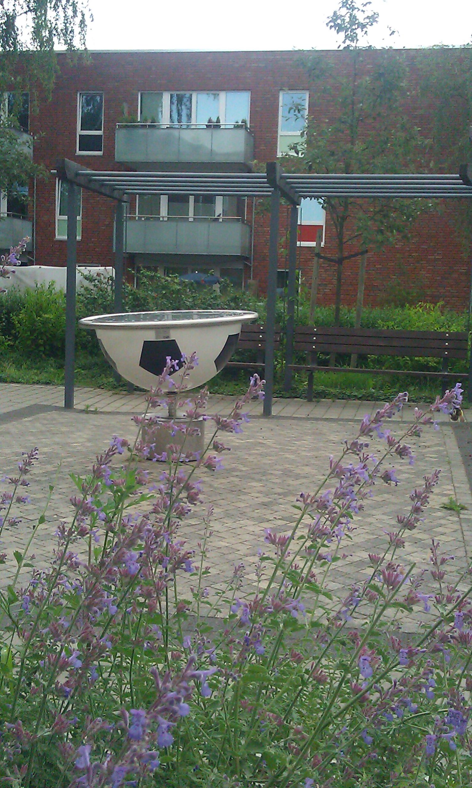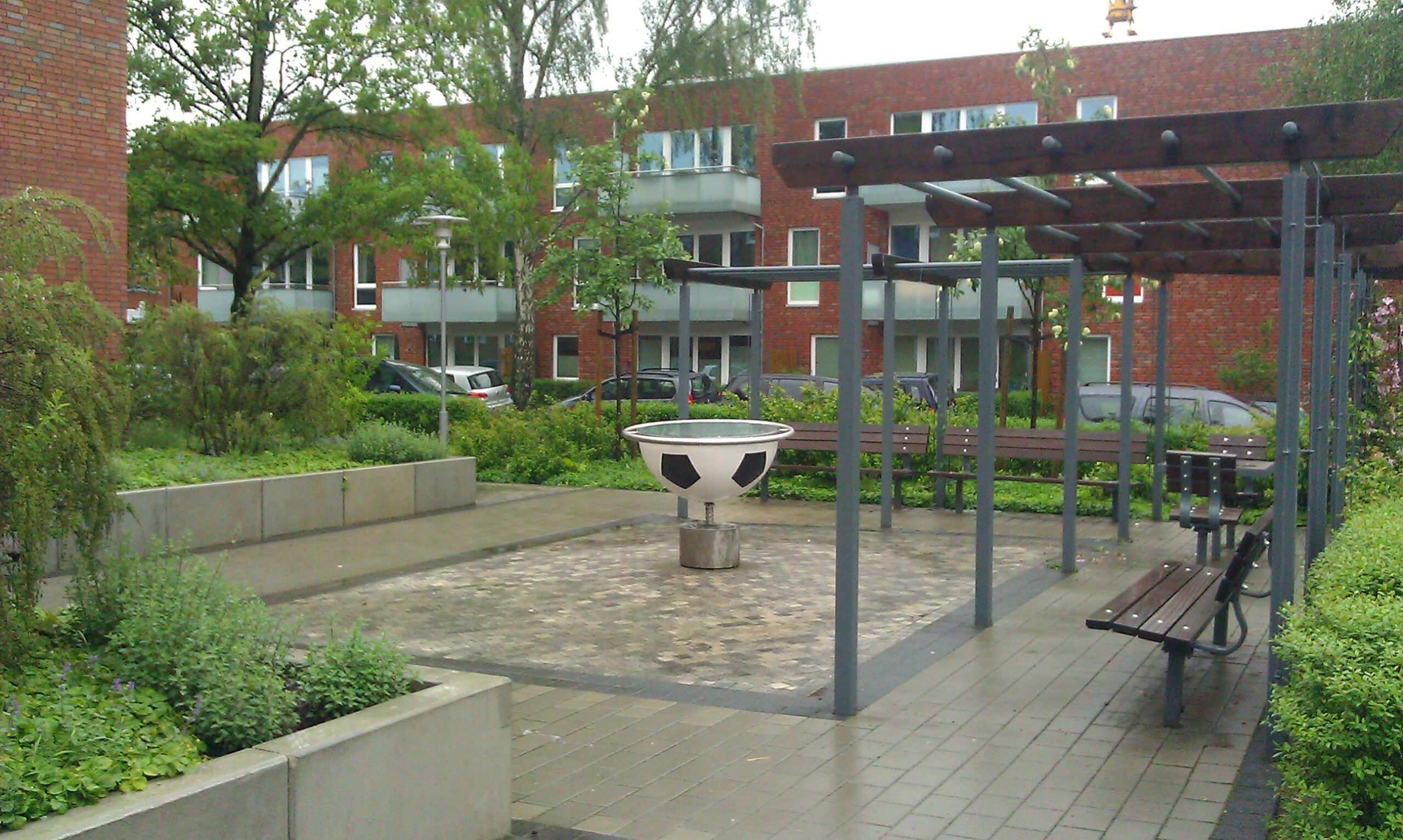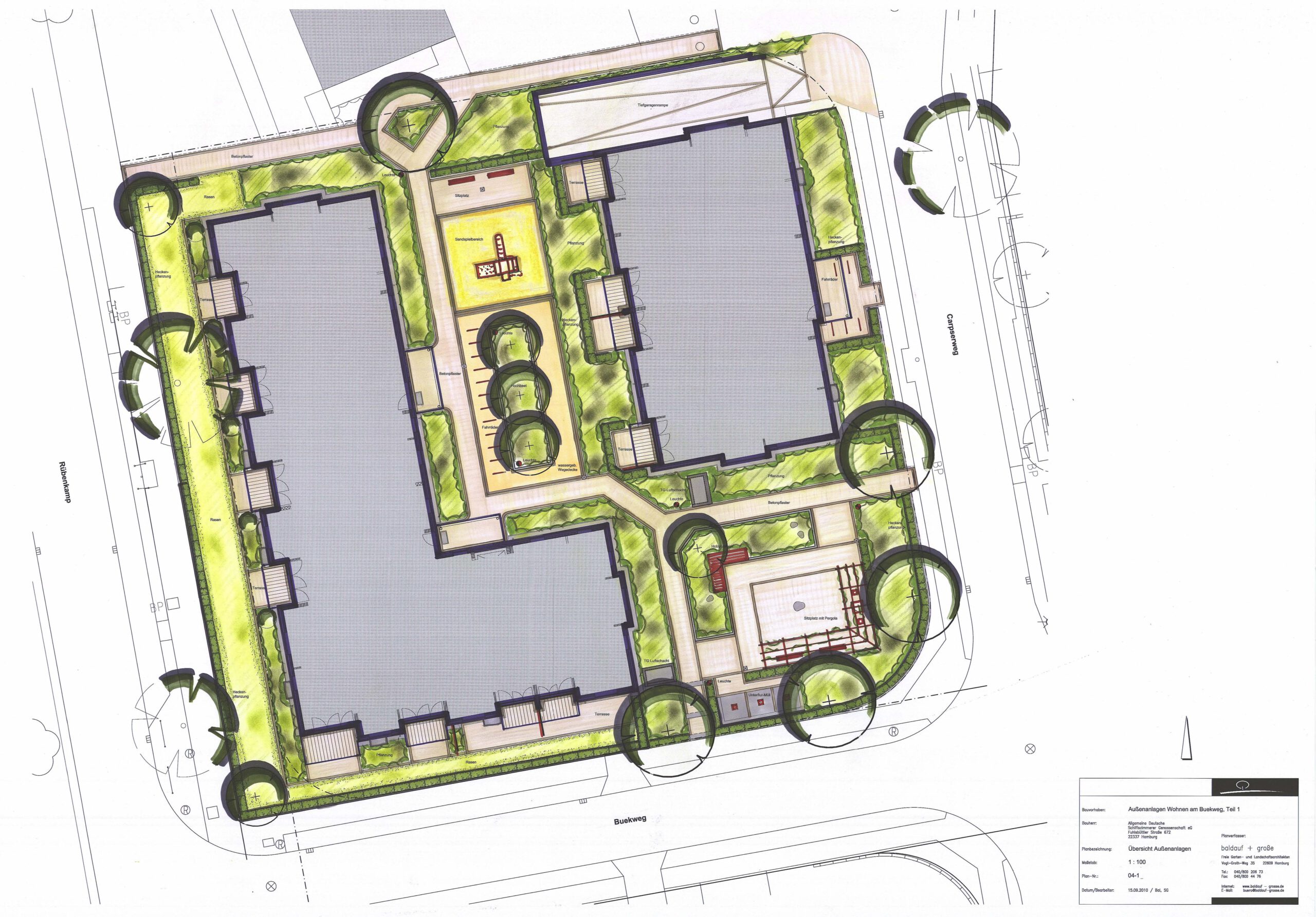 Aufgabenstellung: Die Außenanlage zu den 120 neu gebauten Wohnungen sollte familienfreundlich gestaltet werden, so dass sie eine hohe Aufenthaltsqualität für alle Bewohner bietet. Das Niederschlagswasser von den Außenflächen und den Dachflächen sollte über eine offene Entwässerung abgeleitet werden.